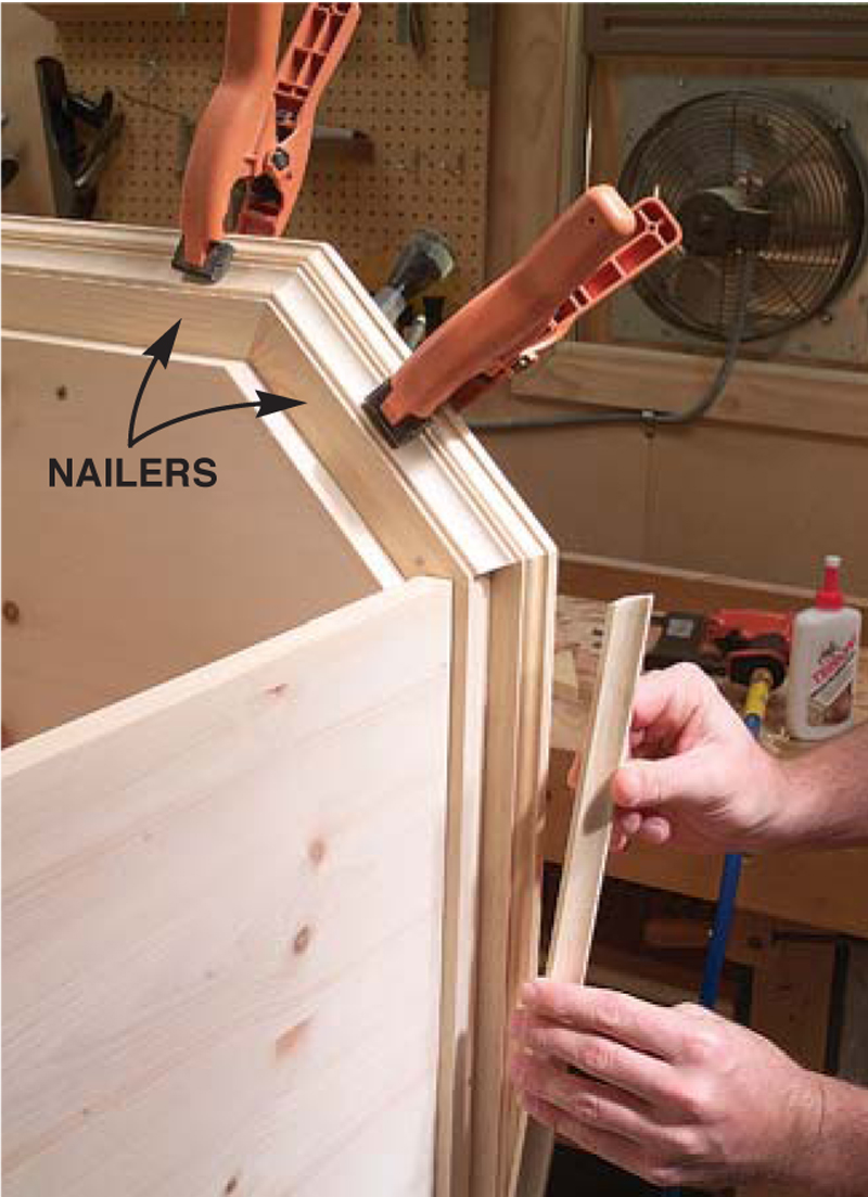 | 10. Apply cove molding under the top and against the edge of the nailers. Hold the molding in place with spring clamps as you go. Fasten the molding with glue and pin nails. |