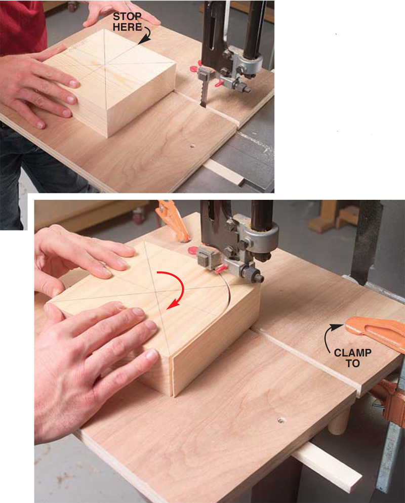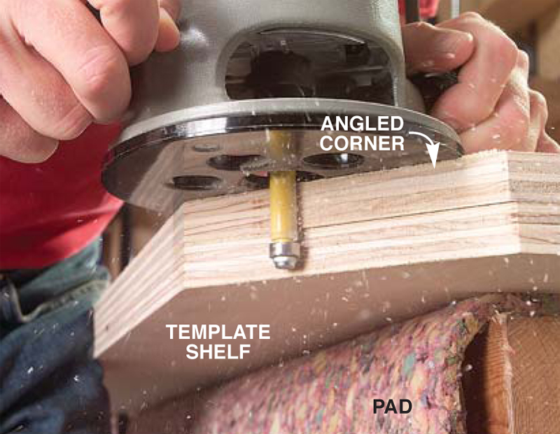 | 1. Make all the shelves identical by using one shelf as a template. Cut the angled corners on the other shelves a bit oversize. Clamp the rough-cut shelves to the template, and trim flush with a router. |