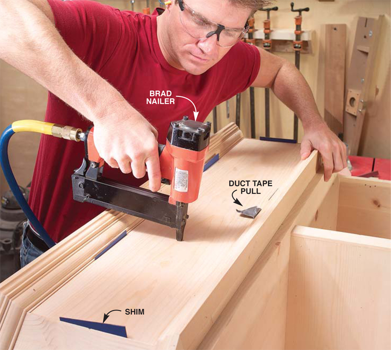 | 7. Attach the moldings with nails and glue. We used special molding glue instead of traditional yellow glue. The thick-bodied molding glue won’t drip or run while positioning the molding. |