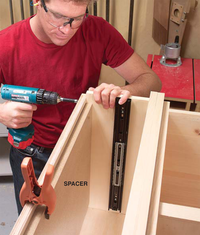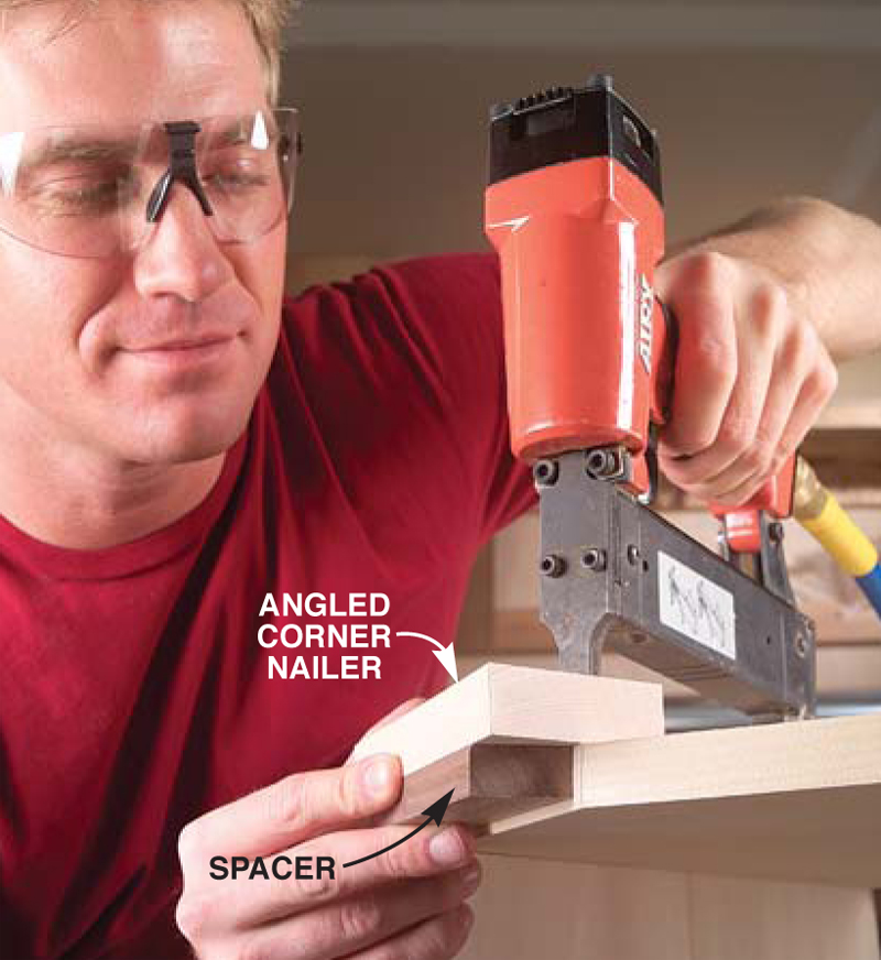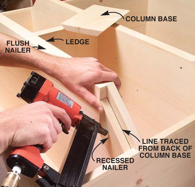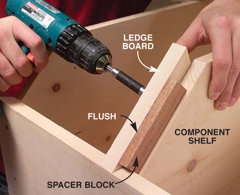 | 4. Create a ledge below the doors with solid wood fastened to the underside of the component shelf. Use a 7/8-in. spacer block to keep an even reveal. |