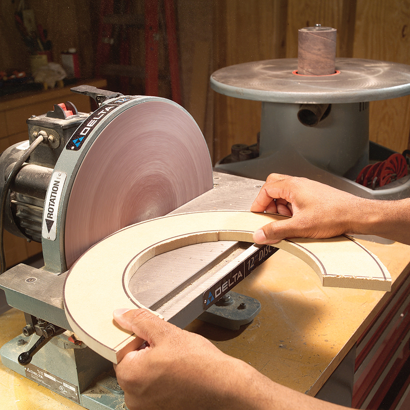 The two most useful tools for shaping and smoothing router templates are a disc sander for outside curves and an oscillating spindle sander for inside curves. A drum sander on a drill press and a belt sander also work well. |