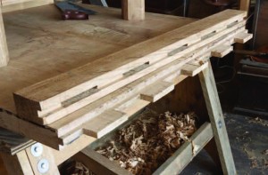 The dimensions of this table were determined by the material I had on hand and the special nature of it. This table can be constructed from conventional lumber – 2″ x 12″ oak for the top, 4″ x 4″ oak for the legs and 2″ x 4″ material for the rest. Conventional woodworking machinery can do a speedy job of it, but I’m a hand woodworker; the feel and texture tell me all I need to know. And I do believe Barnsley would approve.