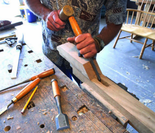 These through-mortises were bored out with a 5⁄8“-diameter brad-point bit. Then I dressed the through-mortises out to 3⁄4” wide by 21⁄2” long with a mortise chisel and a 2″-wide firmer chisel.