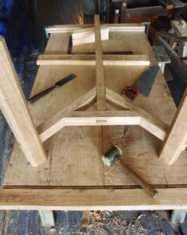 Almost assembled. Here you can see how the stretcher assembly comes together. All the tenons are through-tenons, with the exception of the angled tenons that meet.