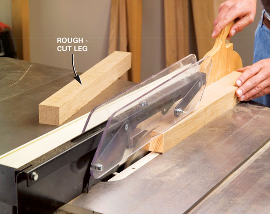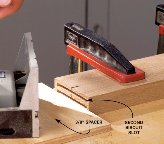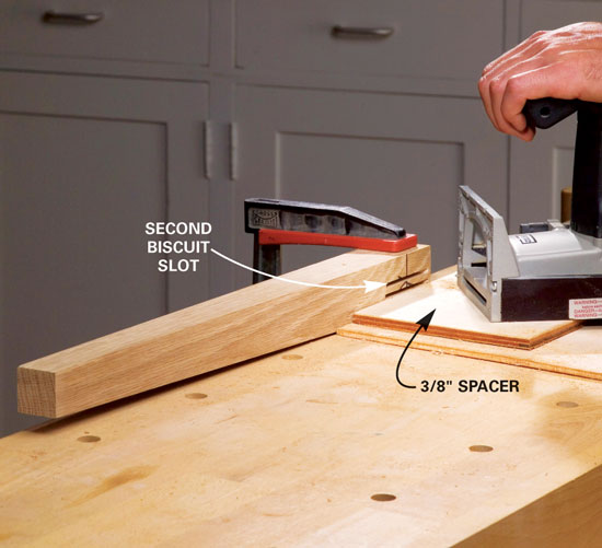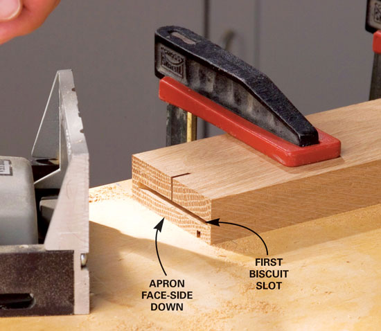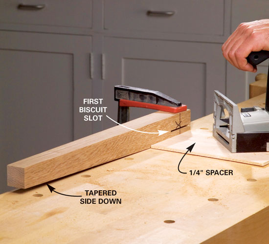 1. Rip thick lumber for the legs to rough size on the tablesaw. Always use a pushstick when cutting narrow boards. Joint, plane and crosscut the legs to final size. 2. Bandsaw two tapers on adjacent sides of each leg. Saw each taper about 1/16″ oversize. The tapers are subtle, so mark an X at the top of each one to help you keep track of which surface is 3. Smooth the tapered sides with your jointer. A freehand bandsaw cut can be fairly uneven, so smoothing might take two passes. Feed the legs top-end first. Use a push block and stick to guide the leg. 4. Cut a pair of biscuit slots in the legs. Add a 3/8″ spacer on top of the 1/4″ spacer. Spacers are far easier to use than fiddling with the biscuit joiner’s fence when you’re making these double slots. 5. Cut the second biscuit slot in the legs. Add a 3/8-in. spacer on top of the 1/4-in. spacer. Spacers are far easier to use than fiddling with the biscuit joiner’s fence when you’re making these double slots. 6. Cut biscuit slots in the aprons’ ends. Clamp the apron faceside down. That’s the side that has a decorative groove cut into it. This time, cut the first slot without the 1/4″ spacer. 7. Cut a second biscuit slot with the 3/8″ spacer under the plate joiner. This is a foolproof system for making the slots in the legs and aprons exactly the same distance apart. 8. Assemble the table base in stages. Glue together two legs and one apron using exterior glue. Make sure both legs lie flat on your bench. Repeat this step with the other pair of legs and apron. 9. Assemble the entire table base. Work on a level surface, such as the top of your tablesaw. This will ensure the finished table won’t wobble. Working upside down also prevents excess glue from dribbling down the legs. 10. Assemble the top. A small paintbrush works great for applying glue to the biscuits and slots. The tile top of this table rests on support boards that are thinner than the rest of the frame. The tile top’s support boards are connected with only a single biscuit.