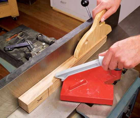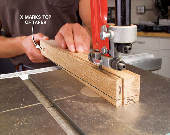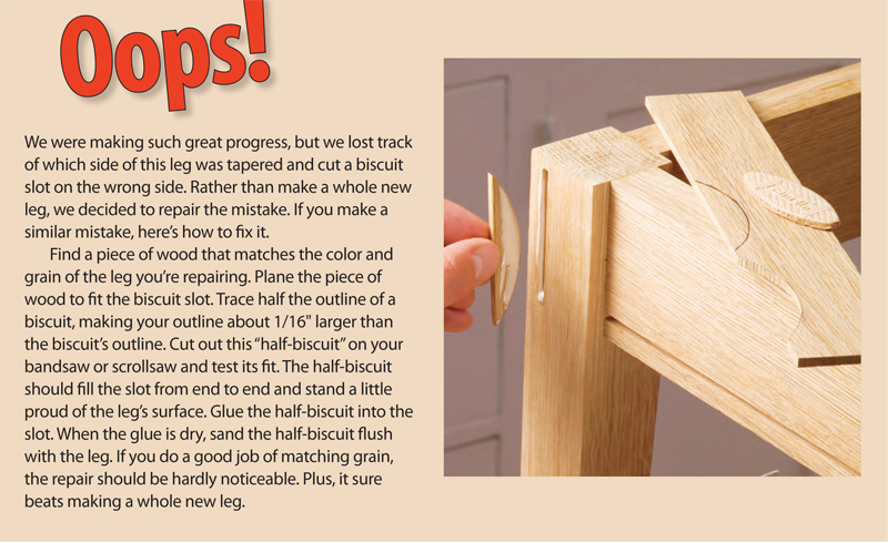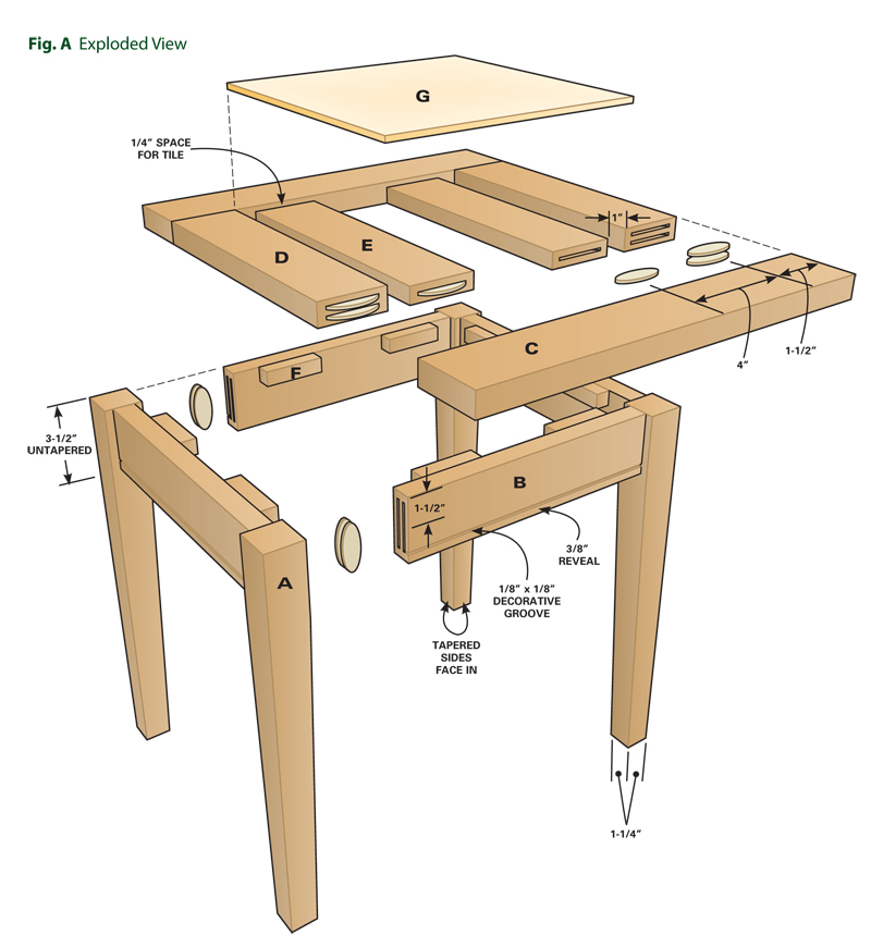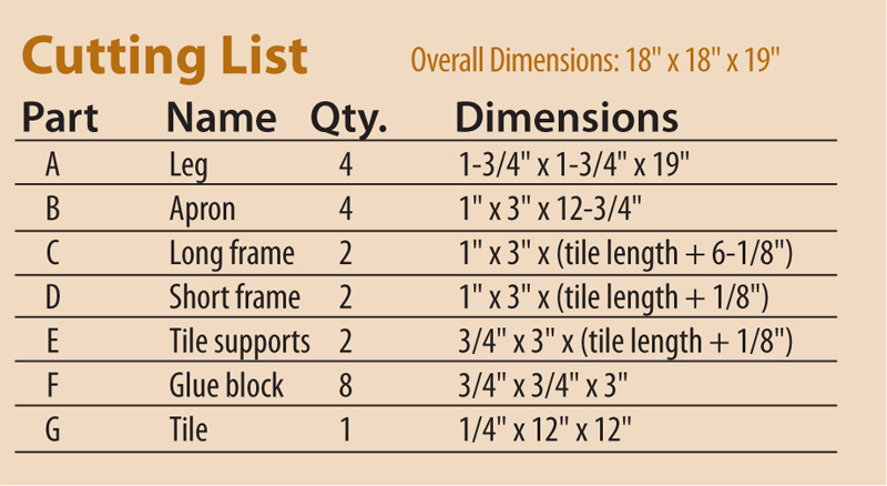 Project Requirements at a GlanceTools: Tablesaw, bandsaw, plate joiner, Materials: 4 bd. ft. of 8/4 (2″) white oak, 8 bd. ft. of 5/4 (1-1/4″) white oak, No. 20 biscuits, one 12″ x 12″ ceramic tile, exterior wood glue, exterior stain, silicone caulk. Total cost : About $75. Before you StartBuy your ceramic tile before you build this table, because the actual size of tiles can vary. We purchased a single 12″ square x 1/4″ thick ceramic tile at our local home center. The actual size was closer to 11-7/8″ square. The tile is undersize to allow a grout joint in normal applications, but the amount can vary. We used white oak for its natural resistance to rot (see Sources, below). Other wood, such as mahogany, teak, cedar or ipe, will also withstand the elements. Taper the LegsStart by sawing the 8/4 lumber for the legs (A) 1/8″ oversize (Photo 1). Then joint, plane and cut to the final size (see Cutting List, below). Next, mark an X at the top of two adjacent sides on each leg. These two marked sides will be tapered. Use these Xs to help you keep track of the tapers. The tapers are subtle and it’s possible to confuse them with the untapered outer sides (see Oops! below). Also, the legs are untapered where they join the aprons (B, Fig. A, below). Mark lines for the tapers on each leg and saw the taper on the bandsaw (Photo 2). Stay about 1/16″ away from your pencil line. After the first taper is cut, reattach scrap with masking tape and cut the second taper. Remove the bandsaw marks with a pass or two over your jointer (Photo 3). Cutting the Double Biscuit SlotsUsing spacers makes easy and accurate work out of cutting the double biscuit slots in the legs. This setup works with any biscuit joiner and the only measuring you need to do is to locate the center of the slot down from the top of the legs (Fig. A). Make sure to cut the biscuit slots in the legs with the adjacent taper down (Photos 4 and 5). Make the ApronsCut the aprons (B) to final size. Cut the decorative groove on the bottom outside face (Fig. A) on your tablesaw using a standard 1/8″ kerf saw blade. The groove is also a handy way to keep track of the outside face of the aprons during the upcoming biscuit-cutting steps. With the decorative groove facing down, cut the double biscuit slots in the ends of the aprons. Cut the first slot without any spacer and the second one with a 3/8″ spacer (Photos 6 and 7). Assemble the BaseFirst make two leg assemblies by gluing two legs and one apron together, then the other two legs and an apron (Photo 8). Make sure the decorative groove on the apron is facing out. Use an exterior glue for this project (see Sources, below). After the glue has dried, complete the table base by adding the other two aprons (Photo 9). Add the TabletopWith your chosen tile in hand, use the information in the Cutting List’s notes, below, to determine the correct lengths Cut the double biscuit slots in the outer frame boards (C and D) with their top sides facing up during slot cutting. Cut Next, glue and clamp the top (Photo 10). After the base and top sections have thoroughly dried, give these assemblies a final sanding. Attach them to each other using glue blocks (F). Apply glue to each block and rub it back and forth several times until you feel the glue take hold slightly (Photo 11). Then put pressure on the block for about five seconds before letting go. Leave the table upside down until the glue is dry. Use an Exterior StainWe chose to apply exterior stain on our table. Exterior stain is very easy to apply with a brush or a rag (Photo 12). Be sure When the stain is completely dry, glue the ceramic tile in place using silicone caulk (Photo 13). Center the tile so there is a 1/16″ space between it and the wood frame. This space provides a place for rainwater to drain away. Now you’re all Oops!We were making such great progress, but we lost track of which side of this leg was tapered and cut a biscuit slot on the wrong side. Rather than make a whole new leg, we decided to repair the mistake. If you make a similar mistake, here’s how to fix it. Find a piece of wood that matches the color and grain of the leg you’re repairing. Plane the piece of wood to fit the biscuit slot. Trace half the outline of a biscuit, making your outline about 1/16 in. larger than the biscuit’s outline. Cut out this “half-biscuit” on your bandsaw or scrollsaw and test its fit. The half-biscuit should fill the slot from end to end and stand a little proud of the leg’s surface. Glue the half-biscuit into the slot. When the glue is dry, sand the half-biscuit flush with the leg. If you do a good job of matching grain, the repair should be hardly noticeable—and it sure beats making a whole new leg. Sources(Note: This information may have changed since the story’s original publication date.) Groff & Groff Lumber Inc., groffslumber.com, 800-342-0001, 8/4 white oak, $8 per bd. ft.; 5/4 white oak, $5 Woodworker’s Supply, woodworker.com, 800-645-9292, Titebond II Glue, 16 Cabot’s Stain, cabotstain.com, 800-877-