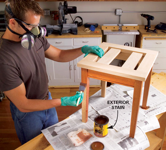 11. Fasten the base to the top with glue blocks. This table doesn’t use any metal screws or brackets that can rust out. You don’t have to clamp these blocks. Just rub them hard back and forth to squeeze out the glue, and then hold them in place for a few seconds until the glue gets tacky. 12. Finish the table with an exterior stain. Let it dry thoroughly before you install the tile top.