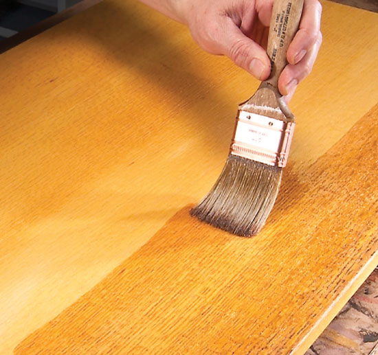 Many great oak finishes begin with a “ground color” dye, typically a yellow or reddish brown. The ground color establishes the finish’s predominate undertone. Apply the dye liberally to bare wood with a brush or spray bottle. Blot up any excess with a clean rag. Even when thinned to manufacturers’ recommendations, dyes produce very strong colors. To avoid too strong a color or problems with lap marks, I recommend thinning the dye 50 percent beyond the bottle directions. You can always add a second or even third application of dye for a darker look, but it’s a lot harder to go from dark to light.
