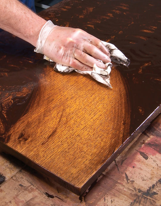 A glaze layer is the secret ingredient to a great oak finish. A dark glaze emphasizes oak’s beautiful strong grain. Glaze is nothing more than a thick stain applied over a sealed surface. Apply the glaze with a stiff brush across the grain. This helps push the pigment deep into the wood’s pores. The glaze is removed with a pair of rags. The glaze left in the open pores of the earlywood turns it very dark. At the same time, the sealed latewood takes up very little stain. The result accentuates the natural contrast in oak’s grain. You can control the color strength on the latewood by either wiping the wood clean or leaving a little glaze behind. Use one rag to pick up the bulk of the stain. When it becomes saturated, it will leave a thin layer of color behind. Use the dry rag to clean up stain in corners or molding profiles. If the glaze ends up too dark or dries too quickly, don’t panic; just wipe the surface with a rag soaked with mineral spirits and start over.