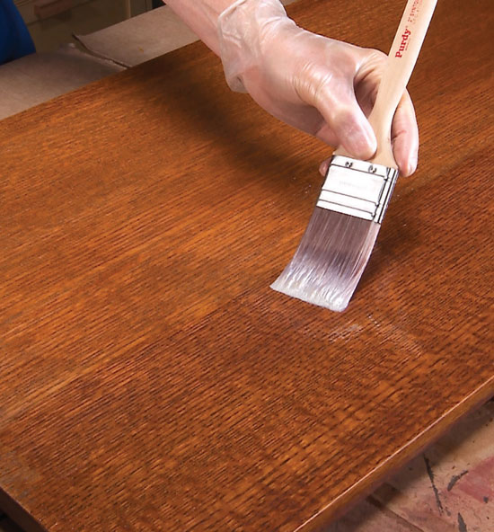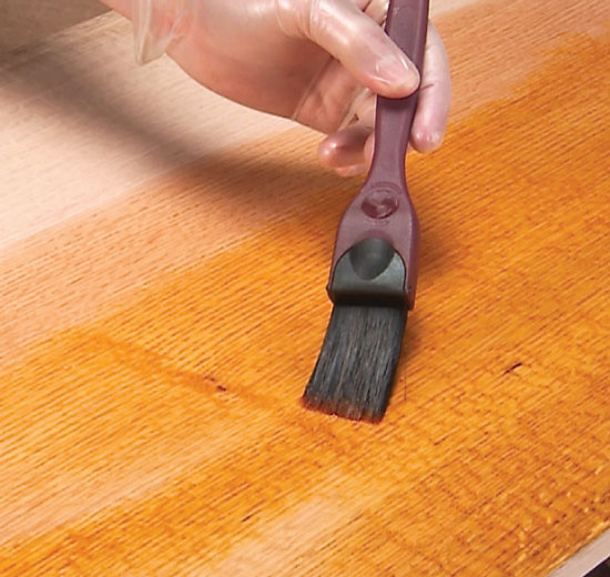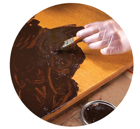 Tip: Cut the bristles of a disposable brush in half. The short, stiff bristles make it easy to scoop the thick gel out of the can and push the stain deep into the wood’s open pores. |