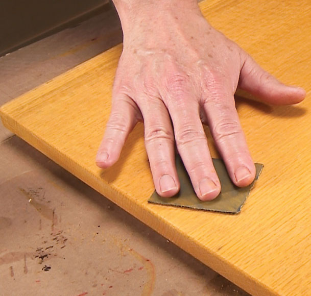 Scuff-sand with 280- or 320-grit paper between coats of shellac and varnish. A light touch is all that’s needed. Care must be taken not to sand through one layer of finish into the next.
