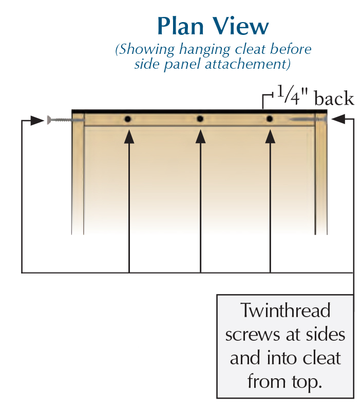 For safety, the attachment cleat must be firmly fastened to the carcase, otherwise a cabinet could be separated from the cleat and fall off the wall, with potentially fatal results. I make a sturdy cleat from solid wood or 34“-thick veneer-core plywood and attach it to the carcase with Twinthread screws run through the top and sides. The cleat becomes part of the cabinet structure, not only supporting the weight of cabinet and contents from beneath the top, but also resisting the kind of leverage (such as that imposed when a child leans on an open cabinet door – please, please teach your children not to do this!) that could pull the cabinet sides away from the cleat if gravity alone were holding the cabinet in place.
