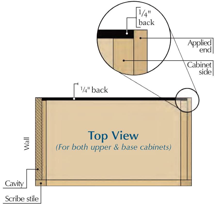 The basic cabinetmaking method above will work well for cabinets that are trapped by walls at both ends. But it’s also designed to allow for finished end panels. I find it more efficient in many cases to build and install the cabinets, whether uppers or bases, then carefully fit and apply finished ends. Regardless of whether the finished ends will be frame-and-panel construction, solid wood sides, or sheet goods custom-veneered to match the cabinets, I cut them roughly to size in the shop, then scribe them to fit on site. The end panels will cover the 14” back, which would otherwise be exposed.
