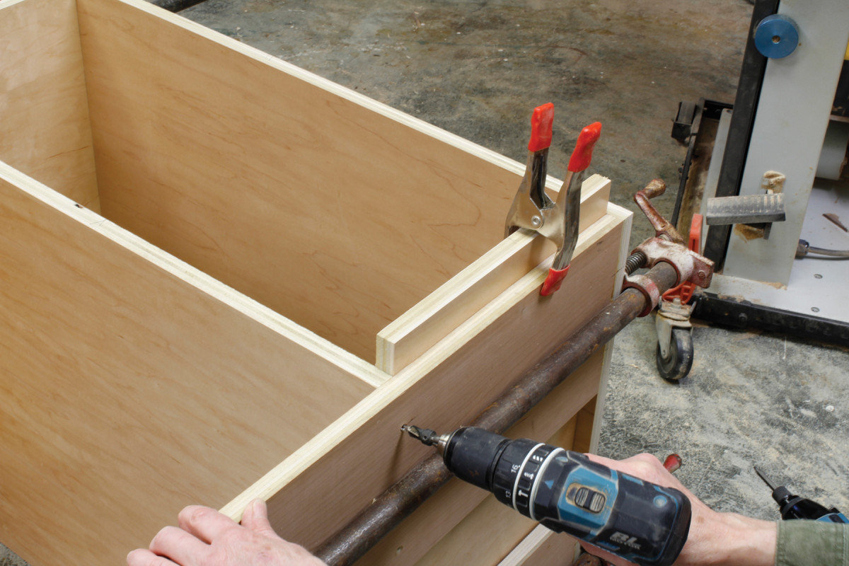 Instead of using a tape measure, I cut a couple of pieces of scrap plywood (one for the bottom, the other for the top) to the distance between the divider and the nearest cabinet side. Clamp the scrap in place and you have an instant way to predrill the screw holes, 38” on center from the edge of the scrap. This method also makes locating the divider a snap when you’re ready to screw it in place.