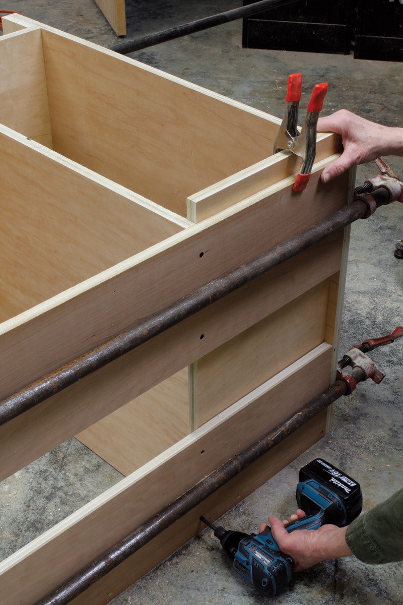 After squaring the cabinet, sight across the top edges to check for winding. Shim at the bottom as necessary to remove twist, then drill and screw. Let the cabinet sit until the glue has set, per the glue manufacturer’s instructions.