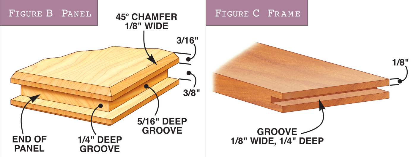7. Cut grooves all the way around the panel (Fig. B). Cut the ends first; then raise the bit 1/16 in. and cut the sides. This added depth in the long grooves leaves room for the panel to expand and contract.