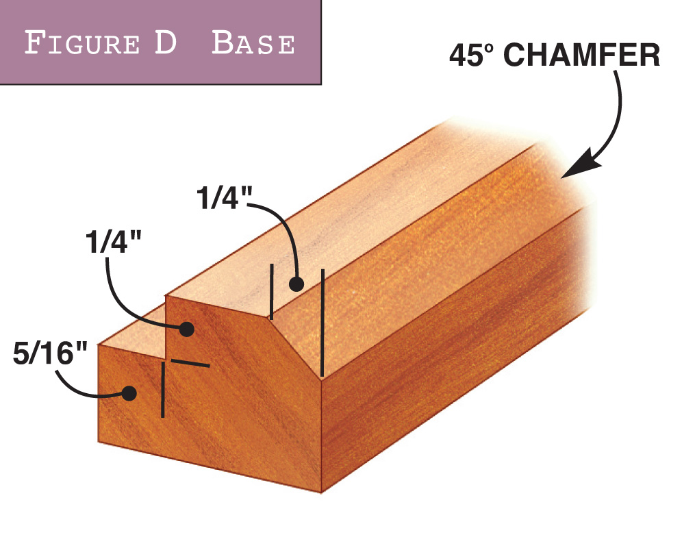 14. Make the base parts (M, N) from one or two long pieces of molding. First, chamfer the outside edge on the router table (Fig. D). Second, cut the rabbet on the router table or table saw. The rabbet’s depth should match the thickness of the plywood bottom (P). Cut the pieces to length.
