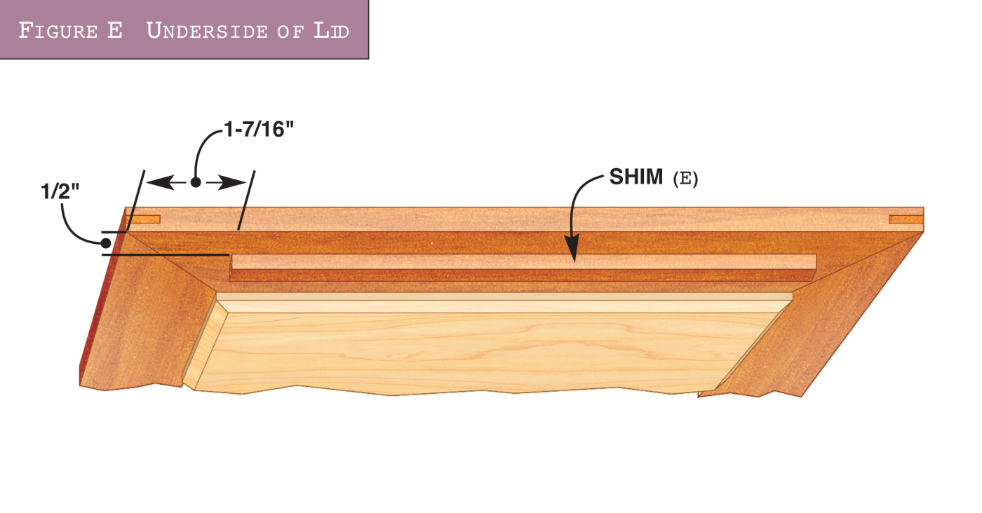 23. A shim (E) fits between the hinge and the lid (Fig. E). To calculate the shim’s exact thickness, place the closed hinge on the back edge of the box. Measure the distance from the top of the hinge to the top of the box and add 1/32 in. Crosscut the shim to fit between the spacers (J), allowing for 1/16 in. of play.