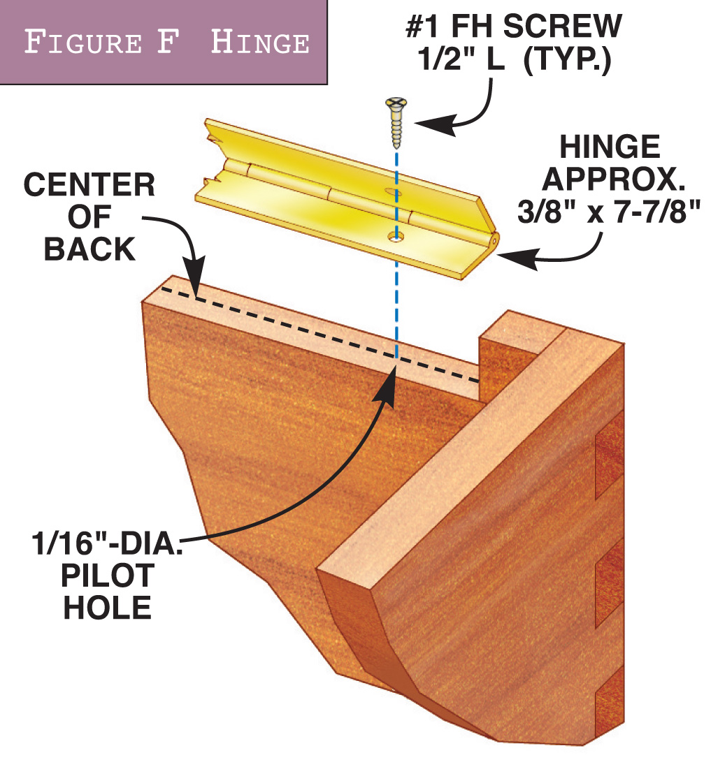 25. The hinge screws are centered on the box’s back edge (Fig. F). Draw or scribe a line down the center of the back. Put the hinge in place and mark the locations of the screw holes with an awl. Set up a drill press with a fence to drill the holes using a 1/16-in. bit.