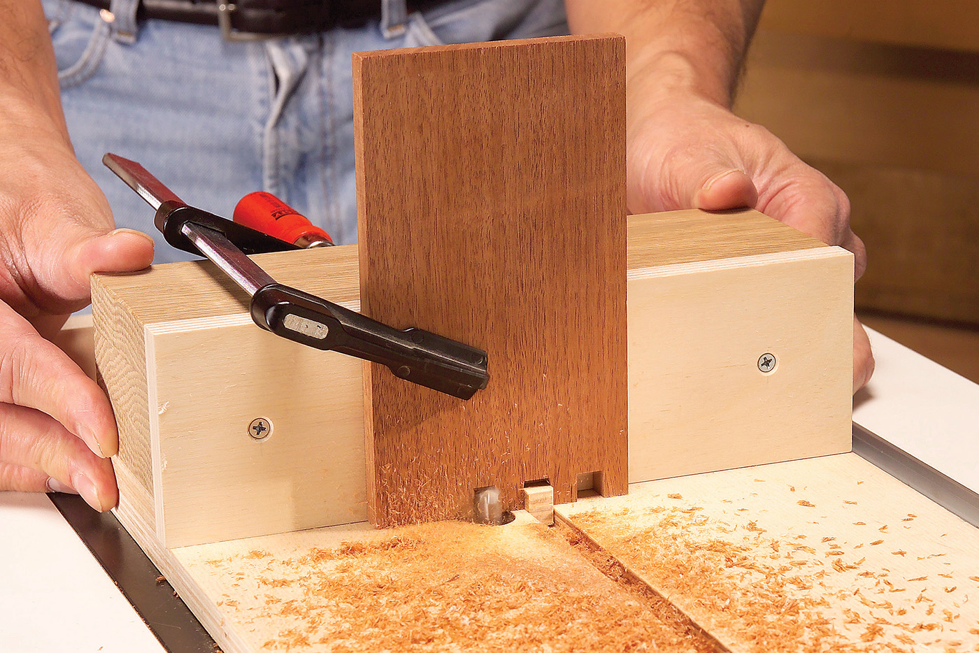 15. Glue the base together with an opposed-wedge jig. To apply clamping pressure, use carpenter’s shims—you’ll find them ready-made at hardware stores.