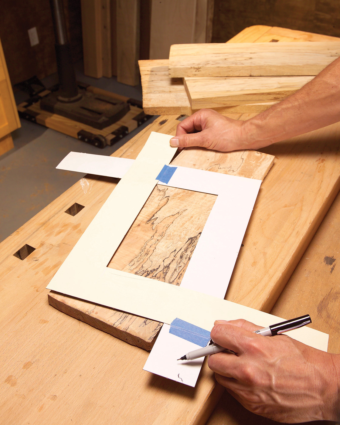 5 Make the lid’s panel from that stunning piece of wood you’ve been hoarding. To find the best grain orientation, make two cardboard L shapes by tracing a carpenter’s square. Tape them together to form a window the same size as the panel.