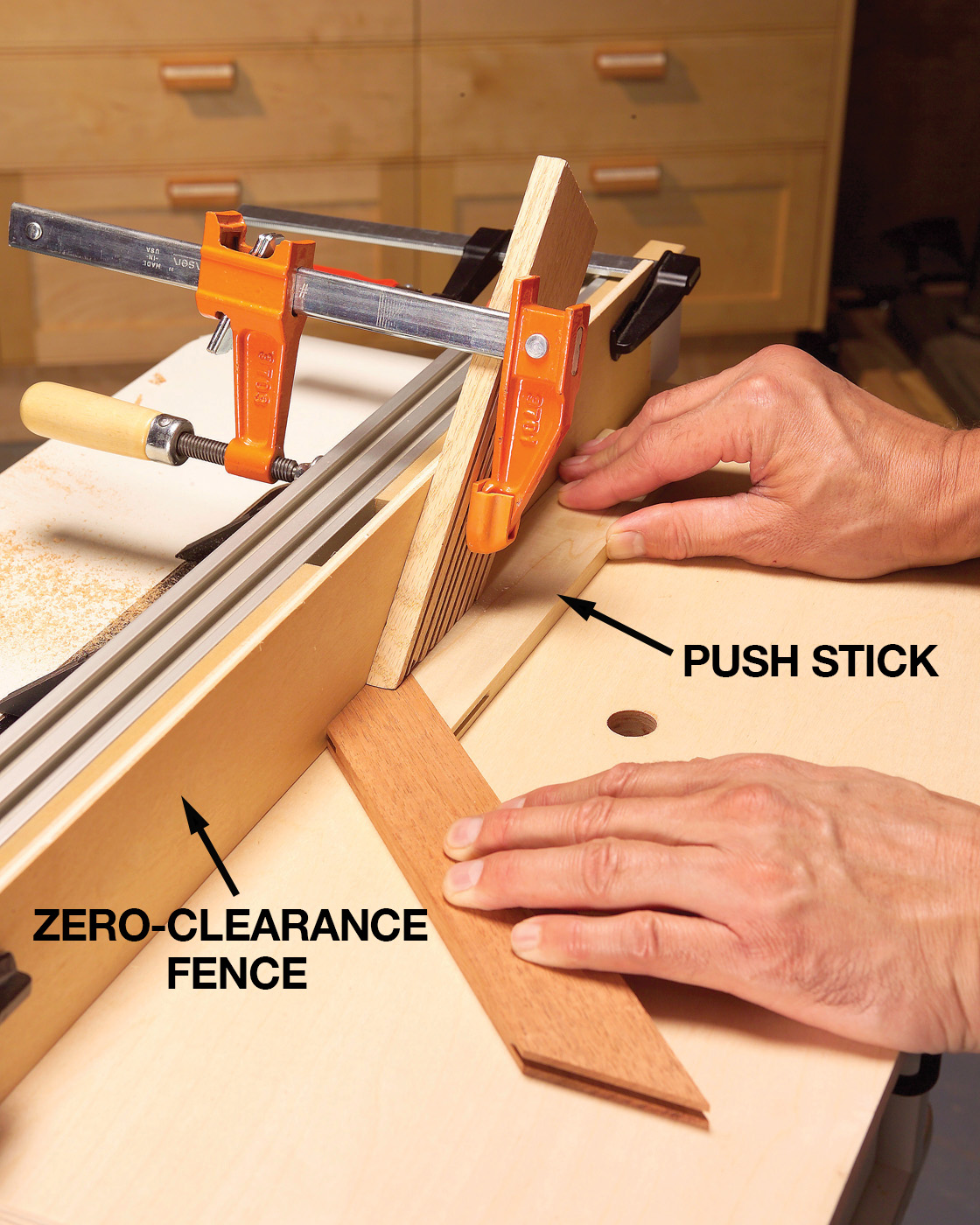 7 Miter the small frame pieces that go around the panel. You could use a simple fence on your miter gauge, but I built a long miter box to safely hold the workpiece, a stop block and the offcuts.