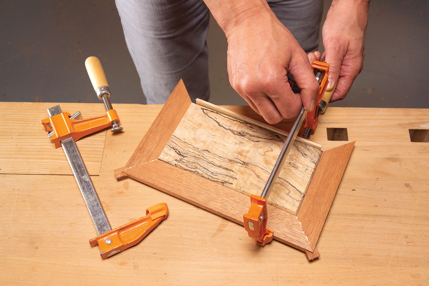 12. Glue the short frame pieces first. Be fussy about aligning their miters with the panel’s corners. Let the glue dry overnight. Then add the long frame pieces, one at a time. Align the miters first; then push in the spline from the joints’ ends.