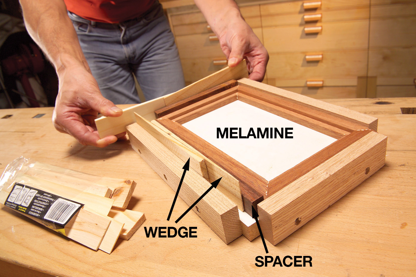 11 Glue the base. Thin pieces can be difficult to clamp, so I borrowed a jig that musical instrument makers use. Clamping pressure is applied by sliding together two opposed wedges (carpenter’s shims). Use the same jig for gluing the sides of the trays to 1/4-in. plywood.