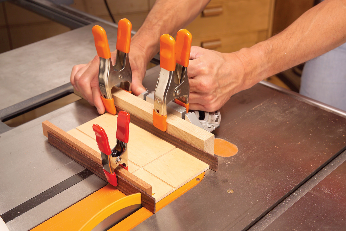 12 Crosscut the trays after gluing on their long sides. The tray’s corners are simply butt joints, so this cut ensures the tray’s bottom and sides are perfectly flush. Use backing boards behind both side pieces to eliminate any chance of chip-out.