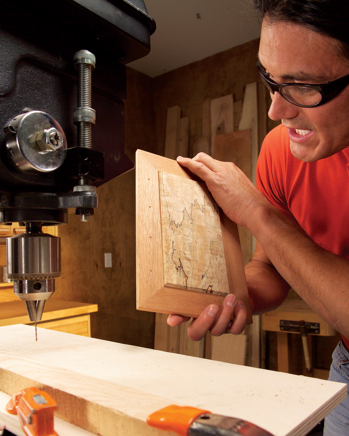 13 Drill holes for the hinges. Use a drill press and a fence with this tiny 1/16-in. bit. Mark each hole with an awl before you drill to keep the bit from wandering.