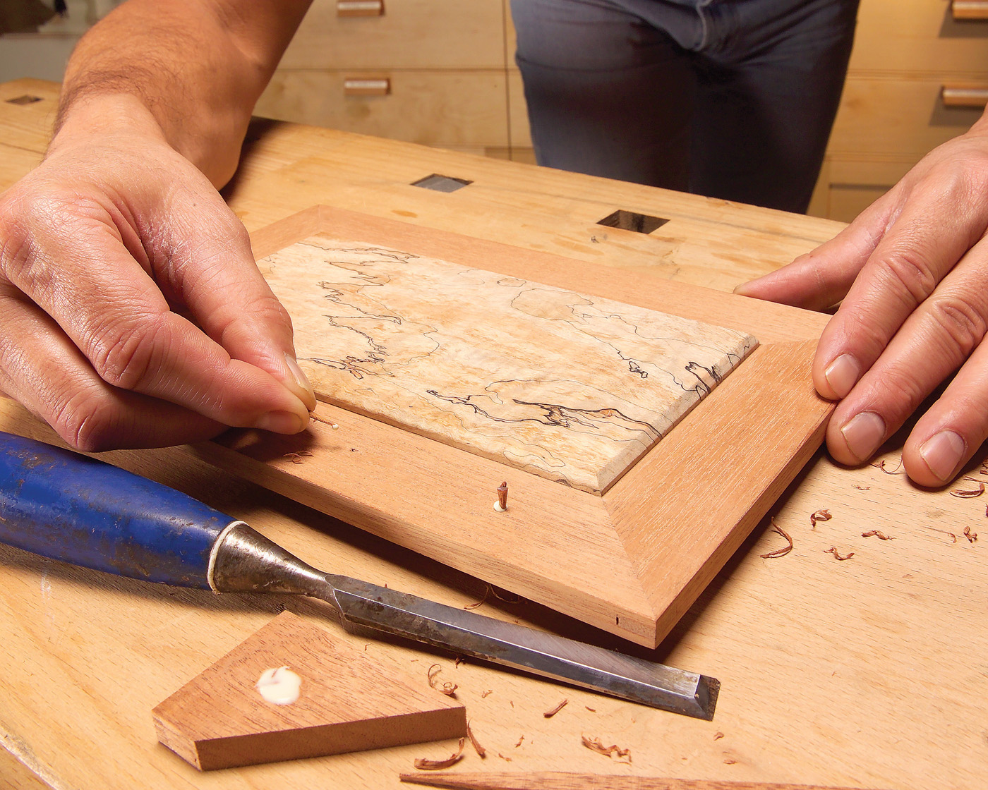 10 Glue the frame pieces in stages. Glue the short pieces first, right to the panel, putting glue only in the middle two inches of the groove. Then add the long pieces, one at a time. Here, glue only goes on the miters, not in the panel’s grooves. The panel is then free to expand and contract, just like a raised-panel door. The splines are visible at the corners of the lid in this image.