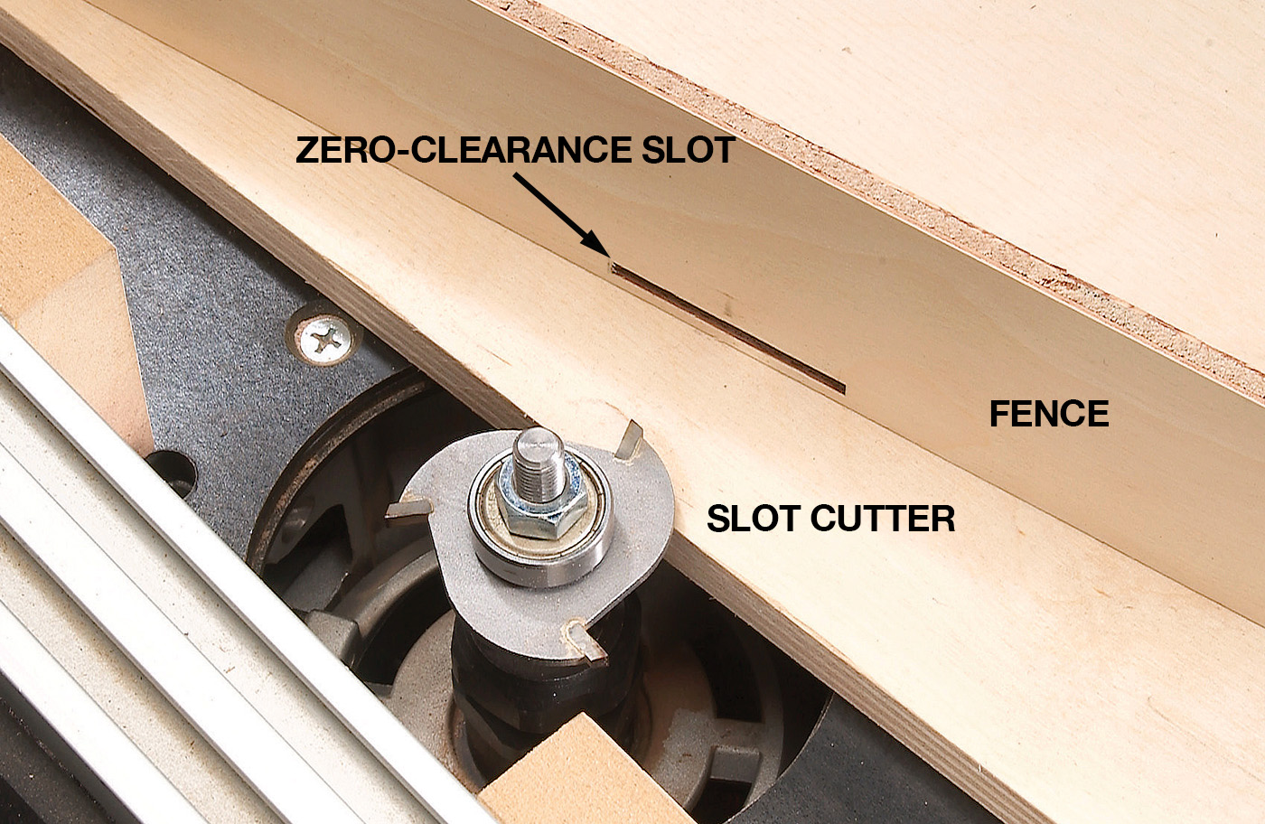 8 Set up your router table for cutting grooves in the frame pieces. Here’s the arrangement, taken apart. The grooves are cut with a 1/8-in. slot-cutting bit. The cutter sticks through a zero clearance slot in a 1/4-in. plywood fence. If your router table has a large opening around the bit, use plywood to cover the hole.