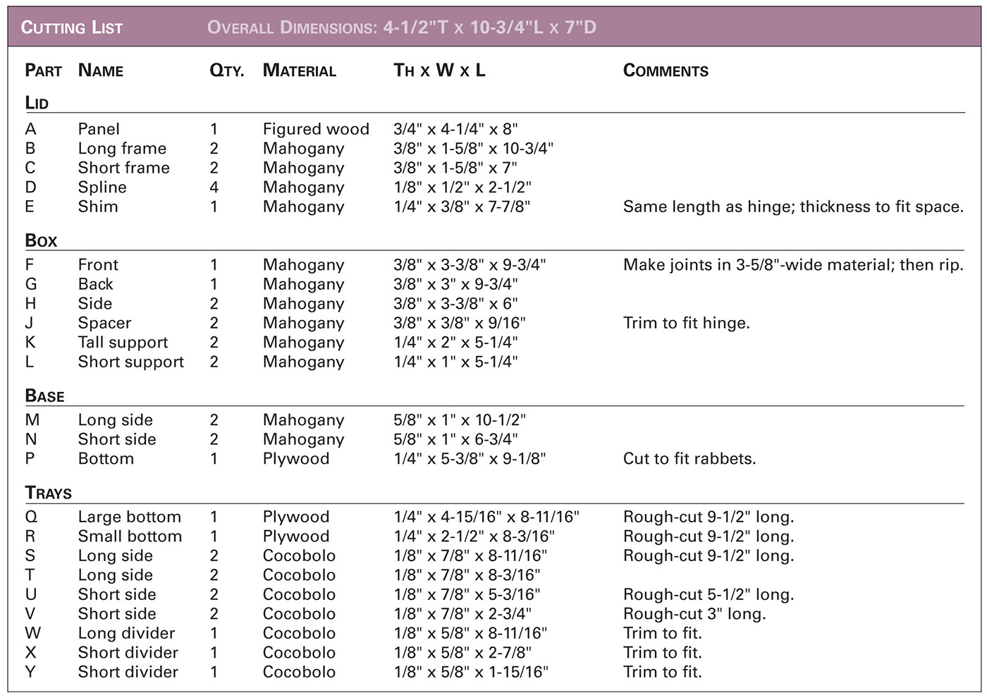 For the interior trays, you’ll need a little 1/4-in. plywood and some 1/8-in.-thick solid wood that looks elegant, such as rosewood. I chose cocobolo.