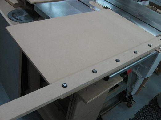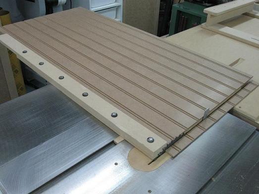 Because of the size of these panels, my shopmade panel cutter is the best jig to use at the tablesaw.