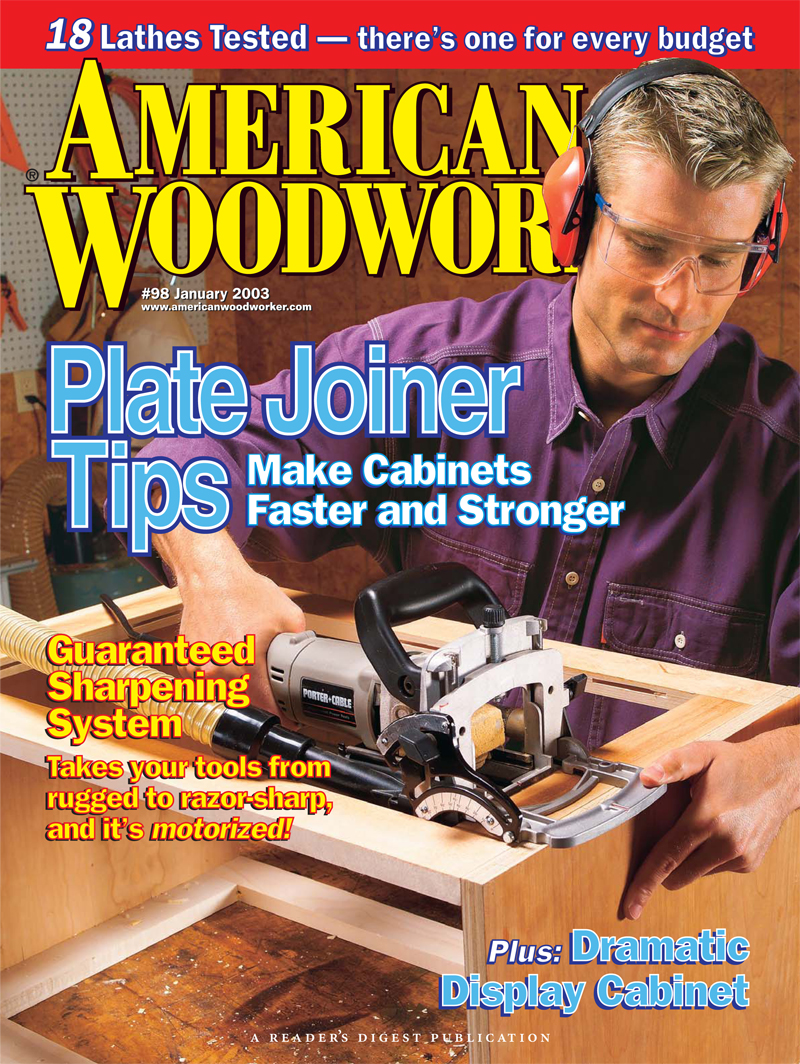 2. Cut biscuit slots with a simple hold-down jig. The jig’s base completely supports the joiner base. The toggle clamp holds the board down flat on the jig allowing you to keep both hands on the joiner for quick, accurate and safe slot cutting. Any clamp can be used to hold down the board; the toggle clamp just speeds things up.