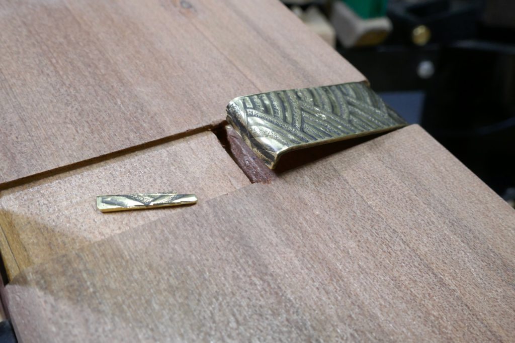 To start, I bent one end of the brass strip and inserted it into the mortise, ensuring a snug fit. From there, I carefully folded the strip around the box, working systematically. At each corner, I reduced the thickness of the strip by filing away about half of its material at the bend points. This made it easier to achieve clean folds while minimizing stress on the metal. I also used my bench vise and a mallet to assist in crisping out the corners.