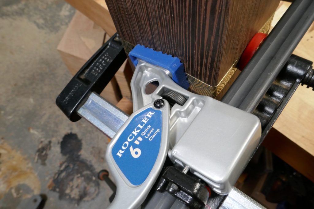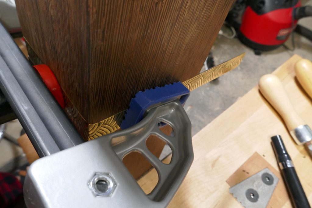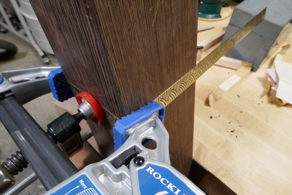 Once I was satisfied with the fit, I prepared for gluing. I crafted custom wood cauls to distribute clamping pressure evenly and applied masking tape to protect the wooden surfaces near the dado from excess epoxy. After mixing the adhesive, I spread it carefully within the dado, positioned the brass strip, and clamped it securely until the glue fully cured.