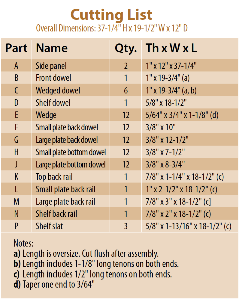 Cut 1″ dowel stock to 19-3/4″ lengths to create blanks for the wedged dowels and the front dowel (B, C). Note: Dowel dimensions can vary from piece to piece. Make sure all your 1″ dowel stock is the same diameter. Cut the 5/8″ shelf dowel (D) to final length. Set the front dowel and the shelf dowel aside.