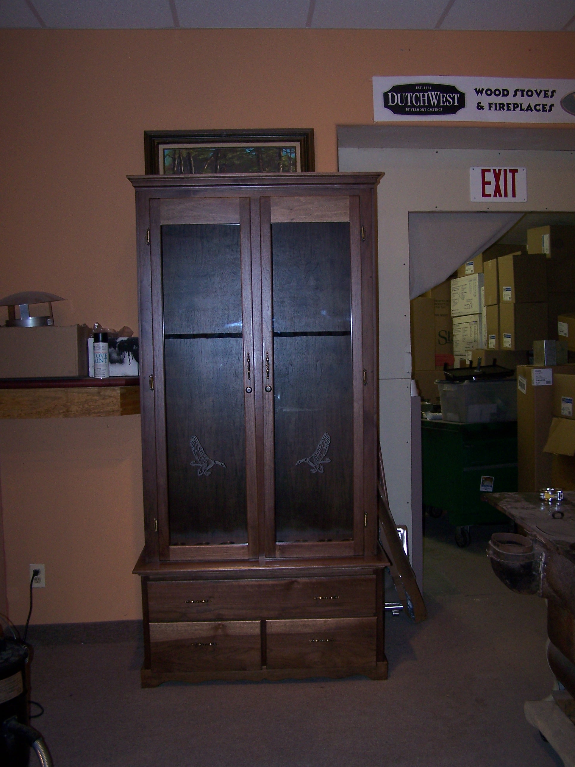 Hi everyone just got done with this 8 gun cabinet. I work in a small shop and find it hard to make large items. The hardest part is being able to spray on the clear coats. Just never enough room to move around and to get rid of the fumes. Sure hope I can come up with a room just for this. Hope you like the cabinet. This is in a friends store and he will sell it.