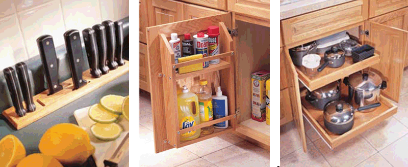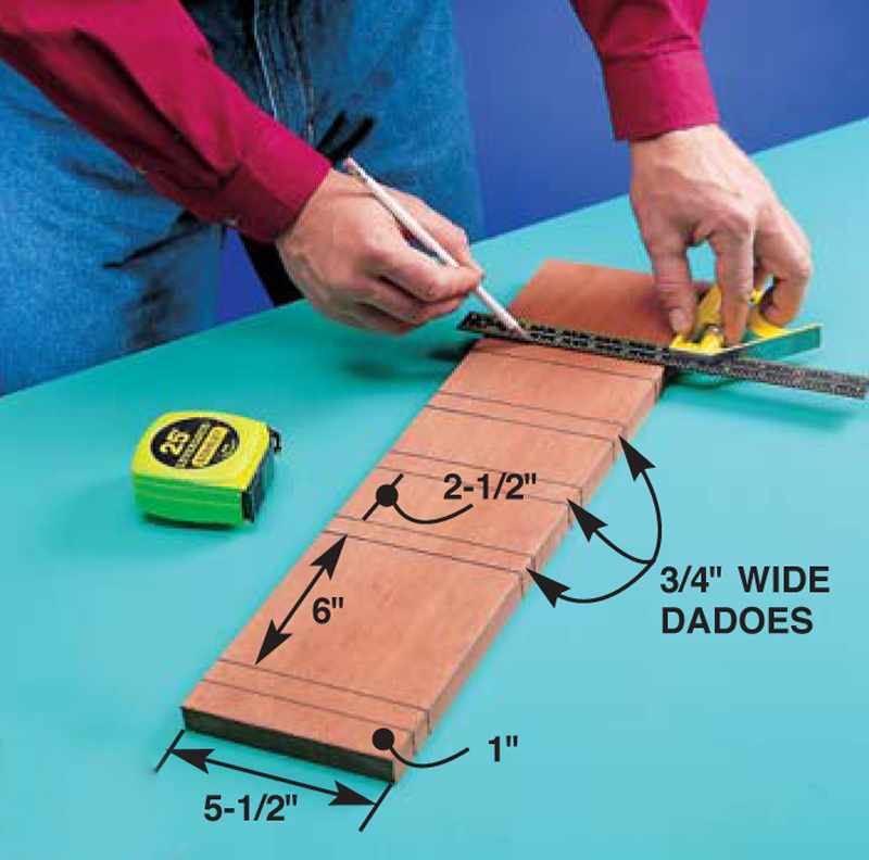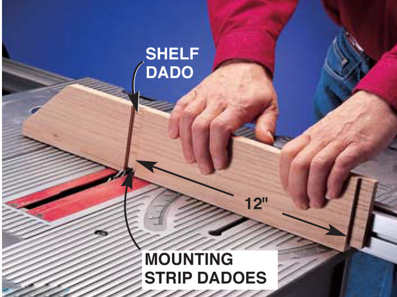 Reach that stuff in the back! 1. Mark the dadoes on one wide hardwood 2. Cut dadoes 1/4-in. deep, then rip the wide 3. Glue the vertical supports 4. Build the plywood trays |