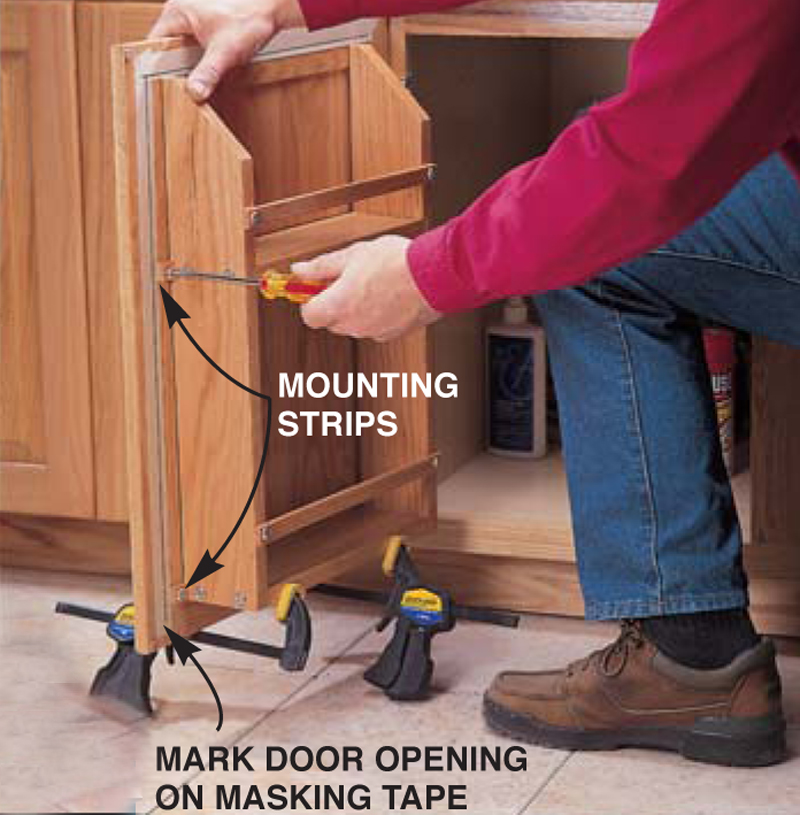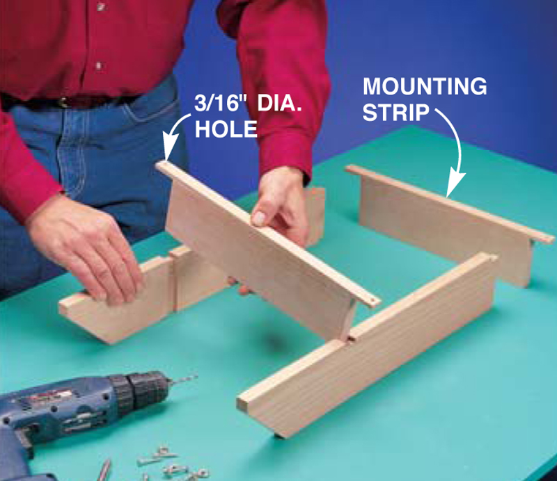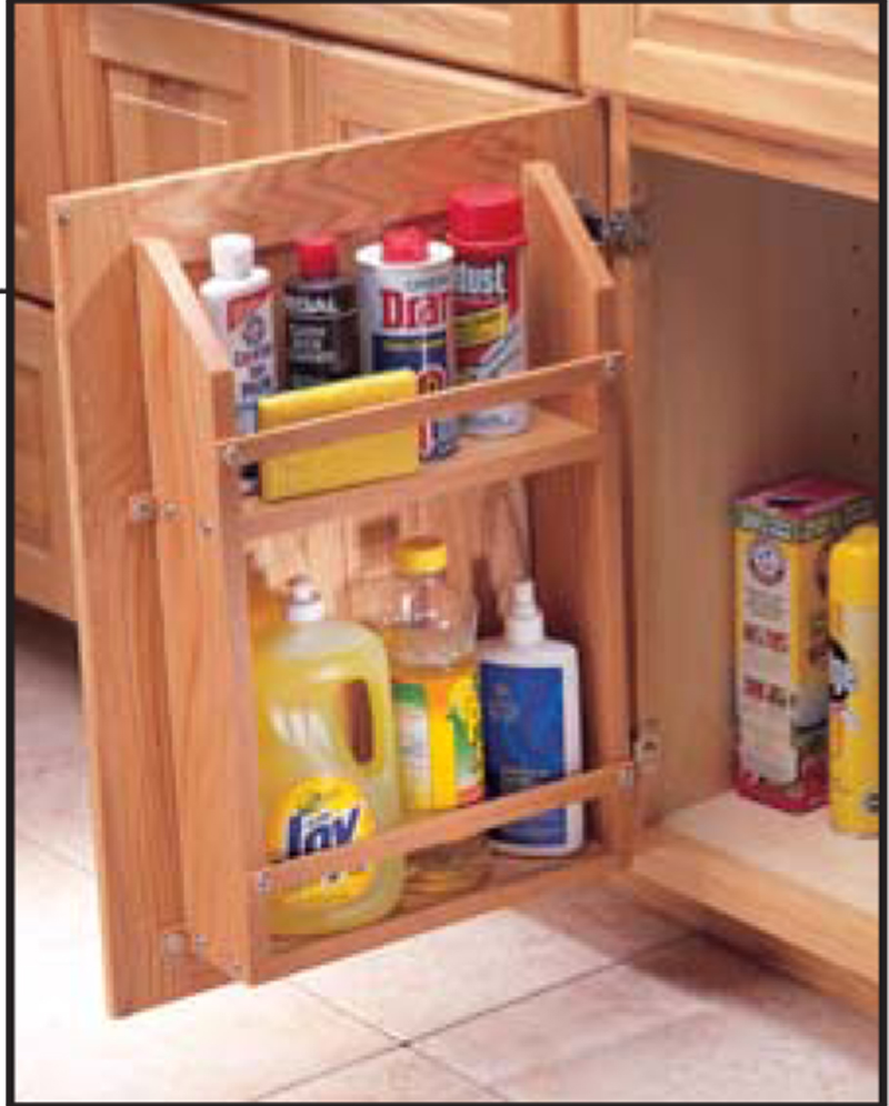 Keep cleaning supplies at your fingertips! 1. Cut two pairs of 3/4-in.-wide, 1/4-in.-deep 2. Slip the shelves into their dadoes. First drill 3. Fasten the rails to the front of the shelves 4. Clamp and screw the |