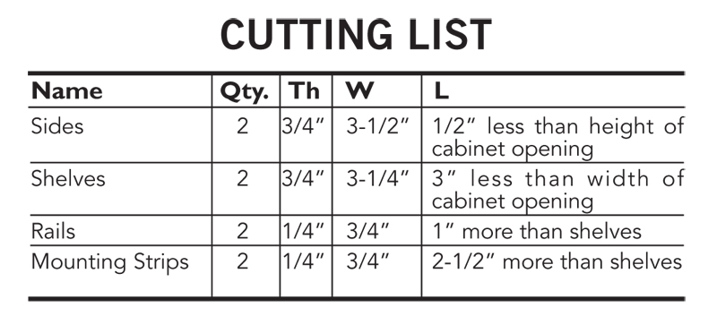 Sink Cabinet ShelfIt’s easy to customize this catchall shelf to fit your You can mount this shelf on a cabinet door Note: If you have small Cutting ListHardware |