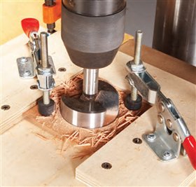 10. Drill a 2- 1/8-in. dia. hole in the center of each piece using a Forstner bit. This jig locks in the piece on three sides to ensure that it doesn’t shift. Toggles keep your fingers out of the way.