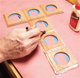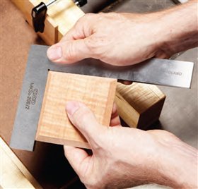 9. Check the angle of the miters by holding the four test pieces together. You may have to adjust the blade’s tilt to make these joints tight. Once you’re set, miter all six “real” pieces.