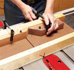 14. Add the righthand hardboard piece and two support boards to the sled. Support piece A is 1- 1/8 in. thick by 2- 1/8 in. wide; piece B is 1-3/4 in. thick by 2-3/8 in. wide. Cut 45- degree miters on both pieces.