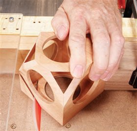 16. Cut all eight corners to transform the cube into a wiffle ball. Set the blade 3/8 in. above the sled, then rotate the cube three times, making three cuts, to remove each corner. Finish the ball by dunking it in Danish oil and spraying it with lacquer.