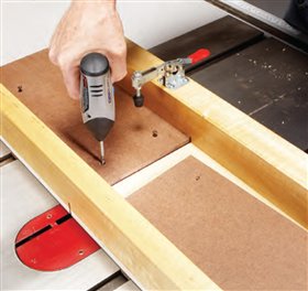 1. Precise cuts, safely done, are essential to making the wiffle ball. To begin, build a small crosscut sled with a fence wide enough to support a toggle clamp.