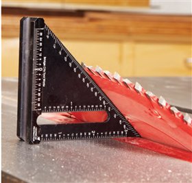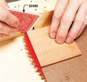 6. On many contractor’s saws, the blade moves out of square when it’s tilted. Hold a wiffle piece against the blade and fence. Tape a shim to the fence if there’s a gap at one corner. Ideally, you’d realign your saw to make it cut square, but this quick fix works well for this project.