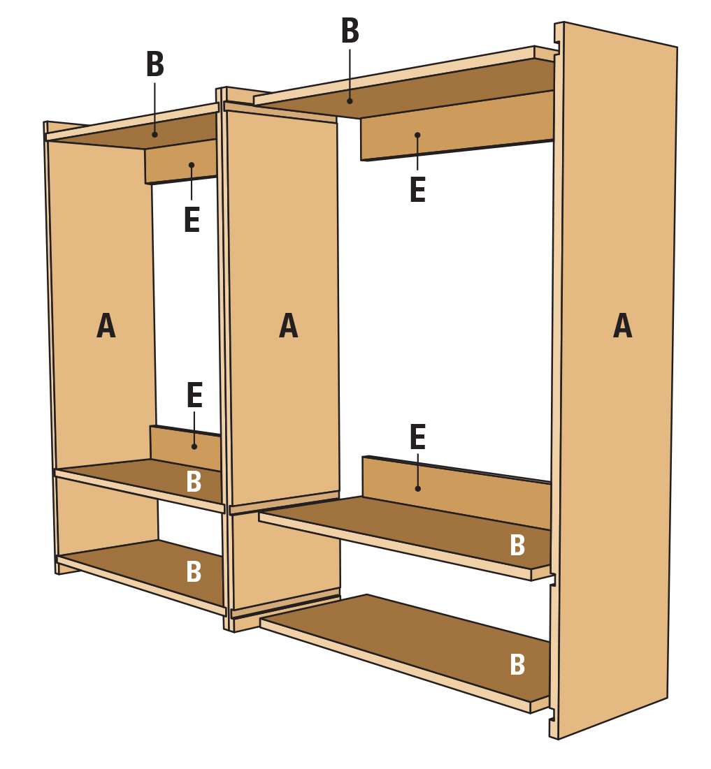 One of the main challenges in cabinet building is breaking down full sheets of plywood. Make sure to have some featherboards and plenty of outfeed support to control the panels. Often, I’ll break panels down with a track saw or cordless circular saw, before taking more manageable pieces to the table saw. Size the plywood panels according to the materials list, starting with the side panels and fixed shelves. Since we’re basically building two 30“ cabinets ganged together, you’ll need 4 side panels. Normally wall cabinets have only 2 fixed shelves per unit, but due to the addition of the open charging cubbies, this wall unit uses 3 fixed shelves per unit, for a total of 6.