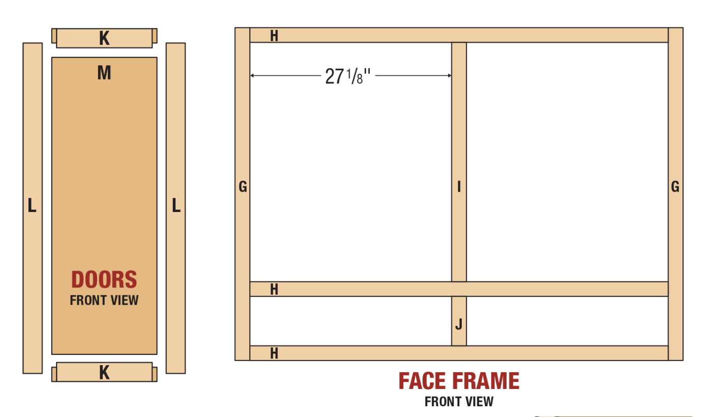 When you buy cabinets from your local home center, you’ll be shocked by the poor-quality materials like MDF, chip board, and plastic corner brackets too. Another thing you’ll see is individual face frames on each upper cabinet. That creates headaches on install day, so instead I gang my cabinets together, and make one continuous face frame. With this approach in mind, align the two cabinets side-by-side and clamp them together. Then permanently join them with nine screws, making sure they stay flush at the front. Now you can take accurate measurements for the face frame components. I usually leave a 1/16“ lip above any shelf, and 1/8“ overhang at the left and right edges. This gives you some leeway when installing the face frame to the cabinet. Cut the face frame parts to size, and drill pocket holes as required. I used hard maple on this cabinet, but I’ve used poplar in the past, and both work fine.
